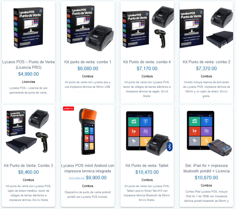 Porque sabemos que todos los negocios son diferentes, Lycaios POS - Punto de venta ofrece diferentes combos para que usted seleccione el que sea mas comodo para usted. Una cafeteria puede comodamente solo necesitar una tableta con impresora termica pero un negocio de miscelanea puede necesitar un equipo de computo con impresora de etiquetas e incluso, un restaurante podria necesitar un equipo de computo con monitor touchscreen con impresoras comenderas para impresion en cocina y barra. Para todos ustedes estimados comerciantes, tenemos una solucion hecha a la medida.